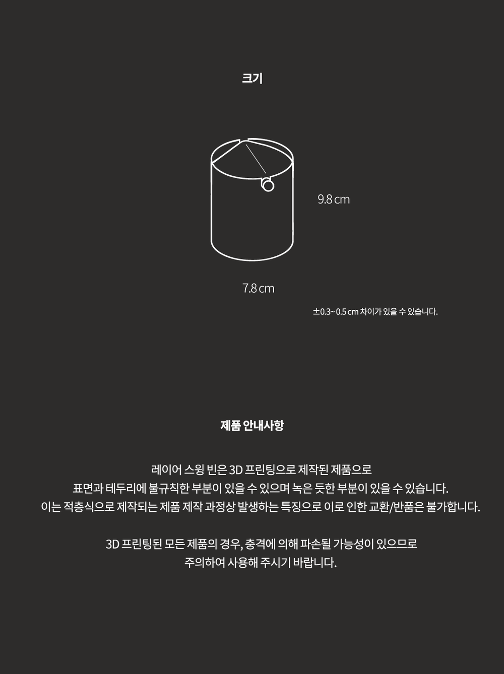 - 제품 특성상 단순 변심, 부주의에 의한 제품 손상 및 파손, 사용 및 개봉한 경우 교환/반품이 불가합니다.