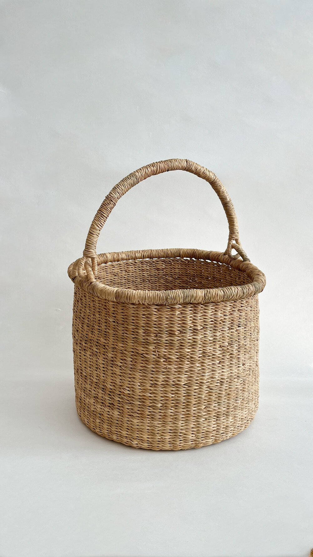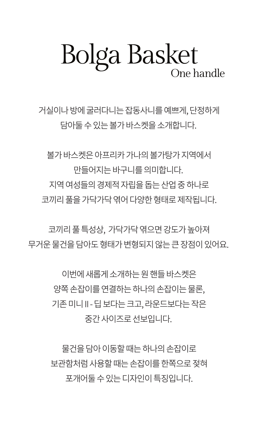 이동성을 높이고 간결한 보관을 완성하는 볼가 바스켓 원 핸들을 소개합니다. 코끼리 풀을 엮어 완성한 제품으로 미니 II - 딥보다 지름과 높이가 커진 사이즈로 더욱 다양하게 보관할 수 있는 크기입니다.