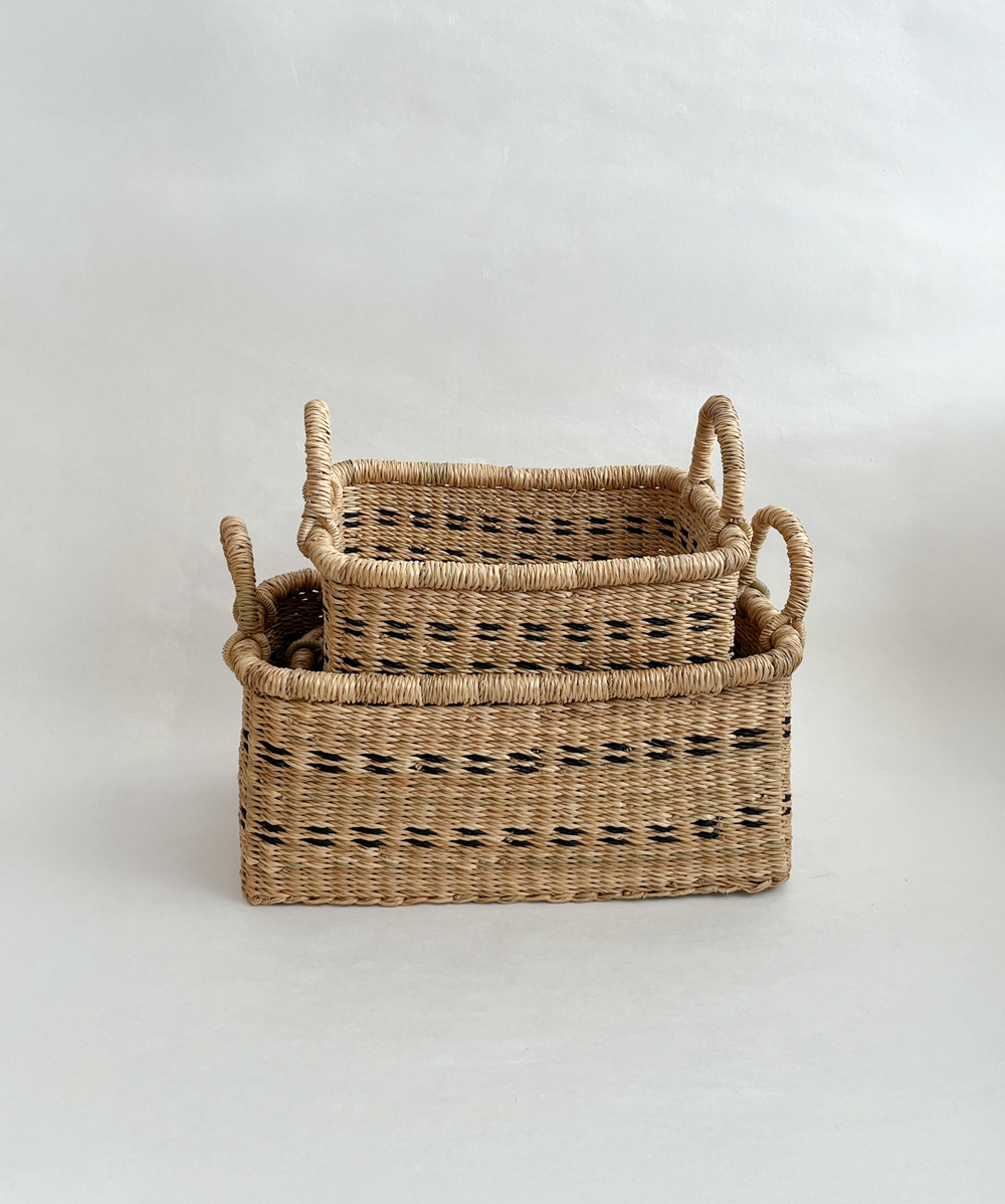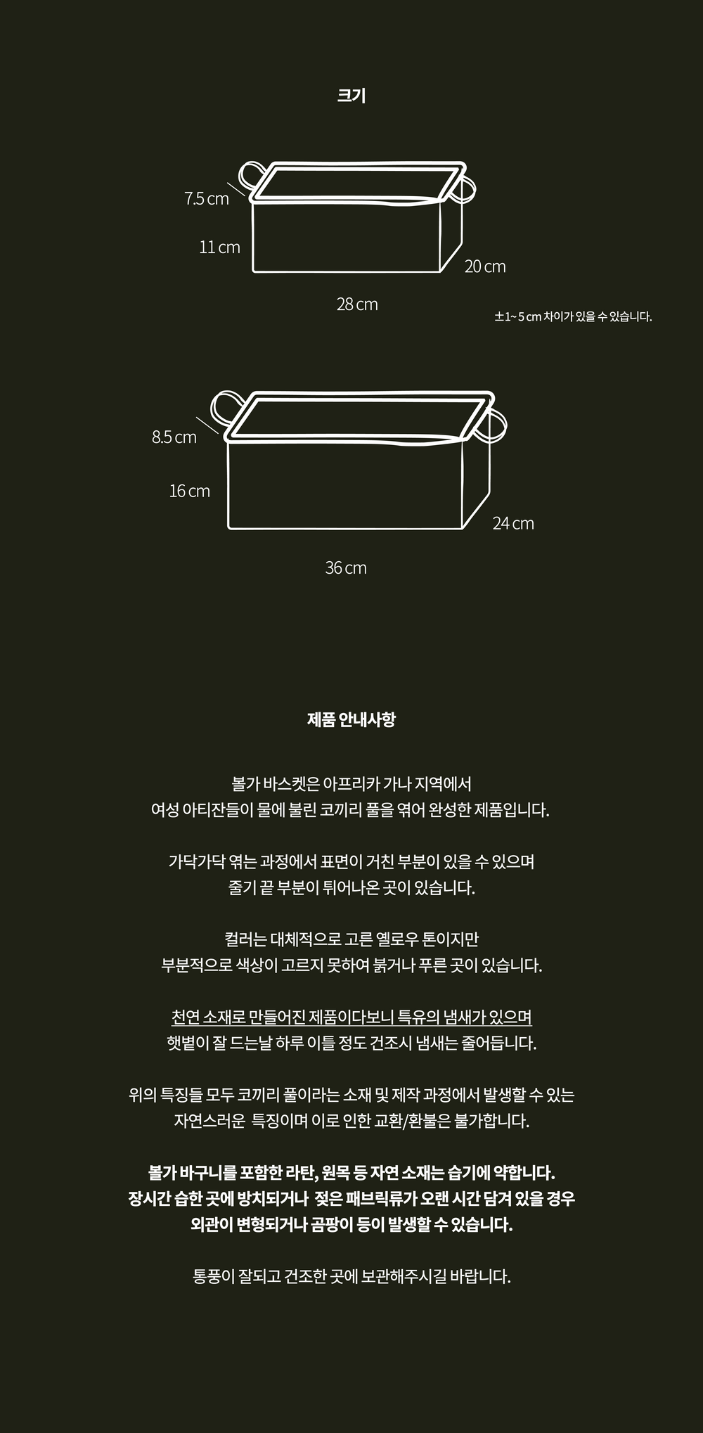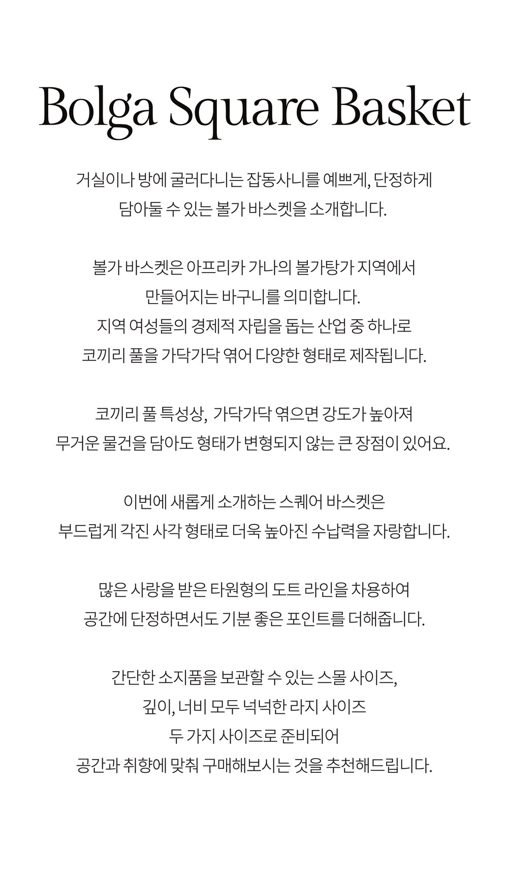 한층 높아진 수납력, 공간에 포인트를 더해주는 볼가 스퀘어 바스켓. 기존 타원형에서 선보인 블랙 도트 라인을 차용하여 단조롭지 않은 디자인을 완성하였습니다. 간단한 소지품을 보관할 수 있는 스몰, 책, 매거진 등을 보관할 수 있는 라지 사이즈 2가지의 크기로 선보입니다.