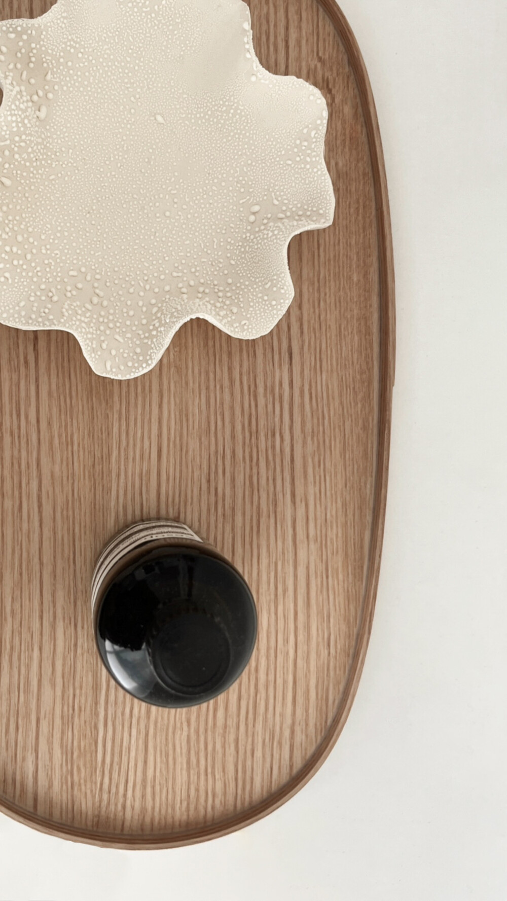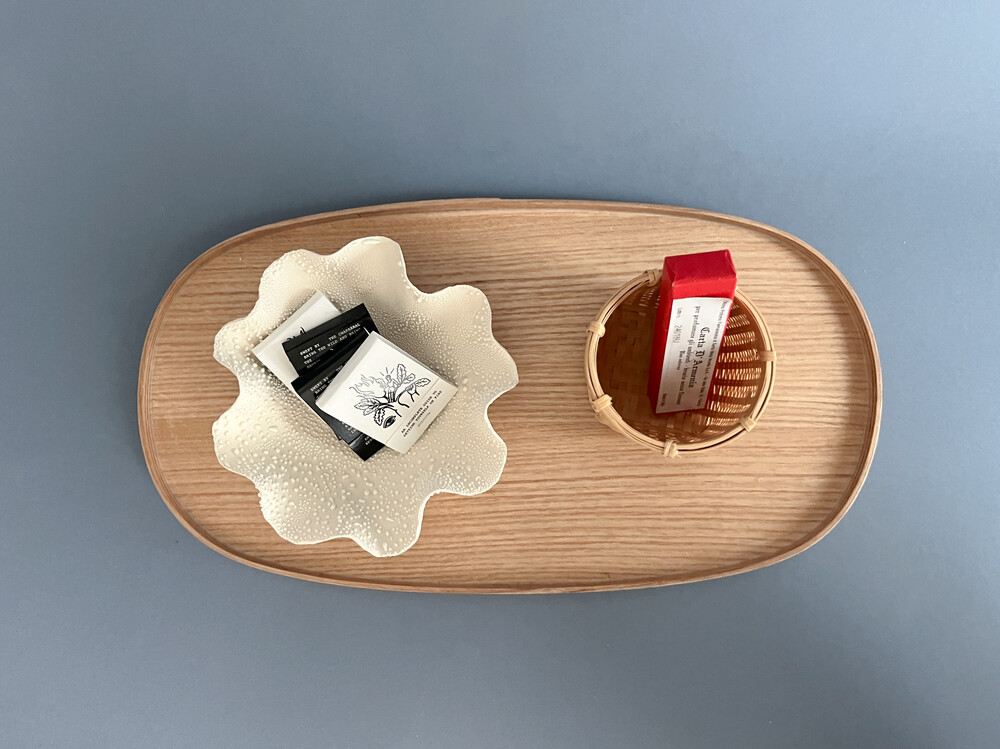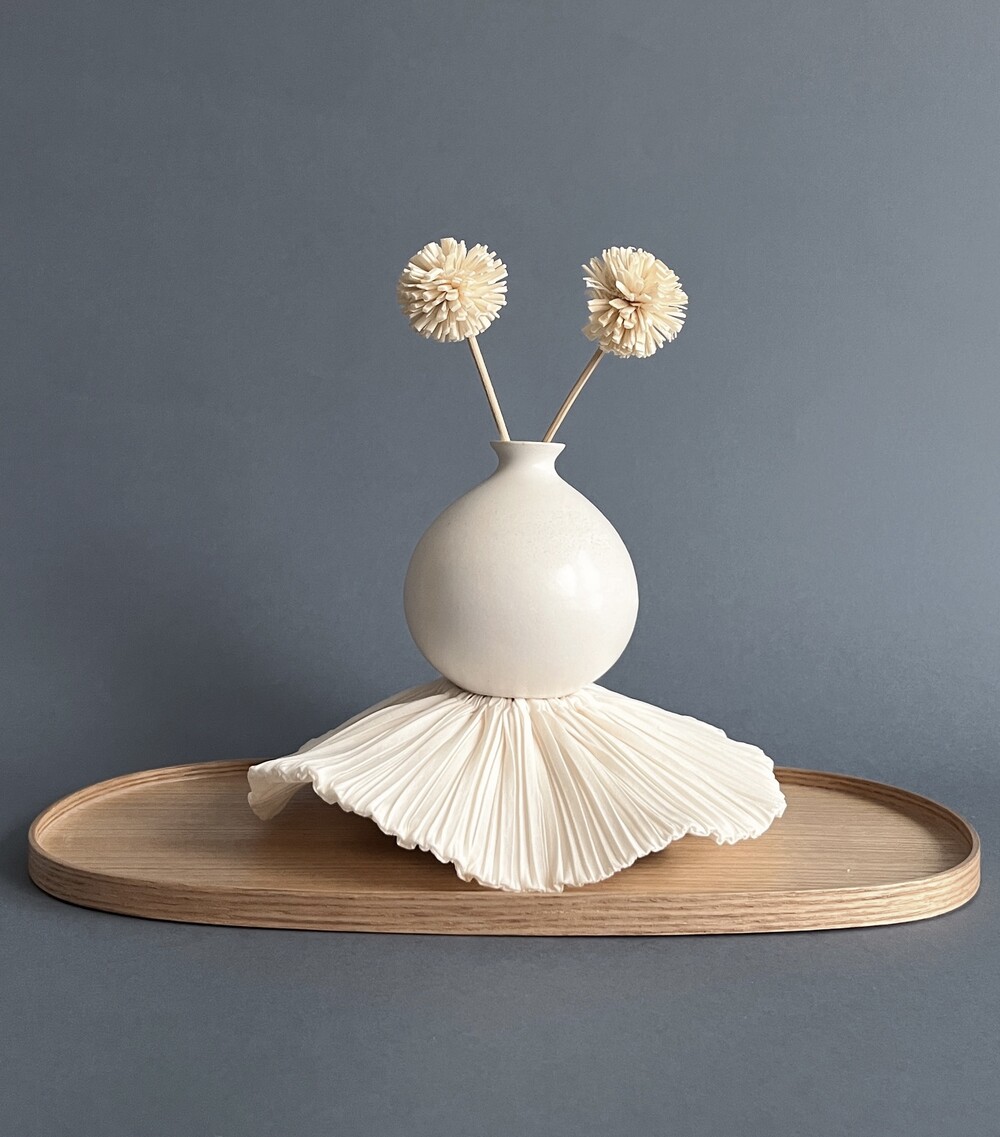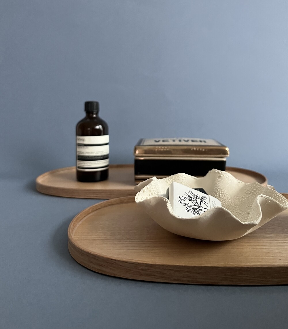 일립스 트레이는 각진 캔들도, 플라운스 형태의 볼도 안정감 있게 담아냅니다.