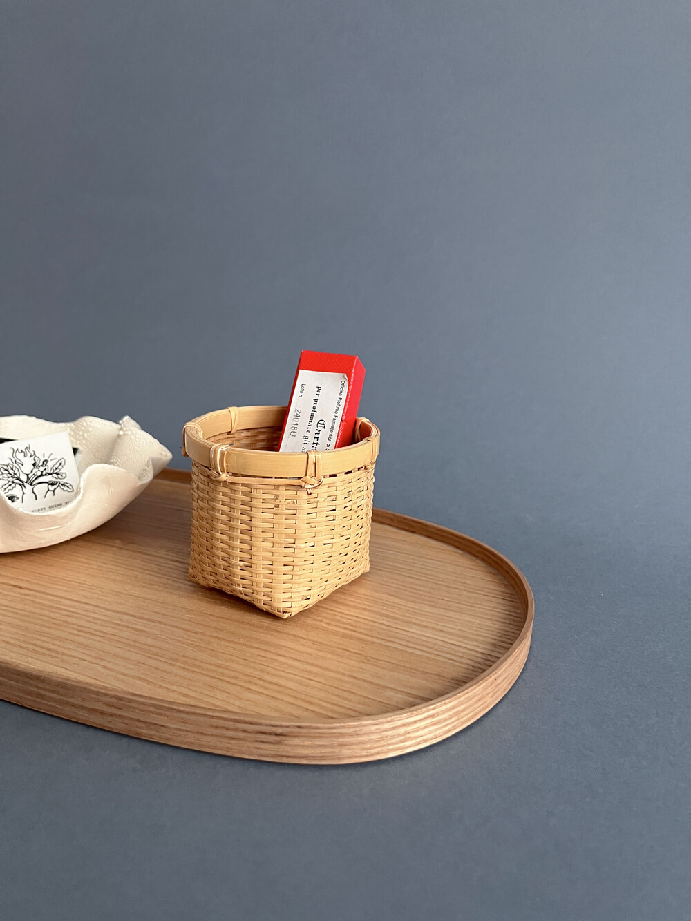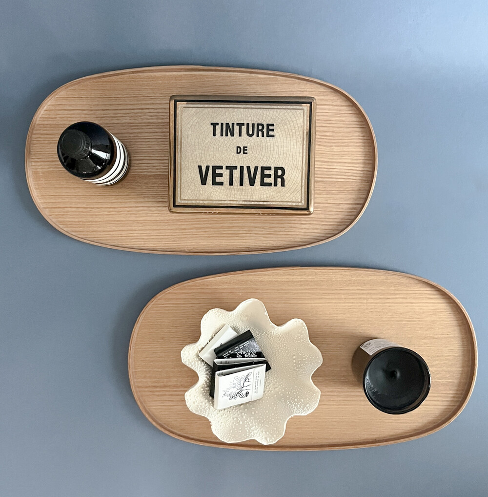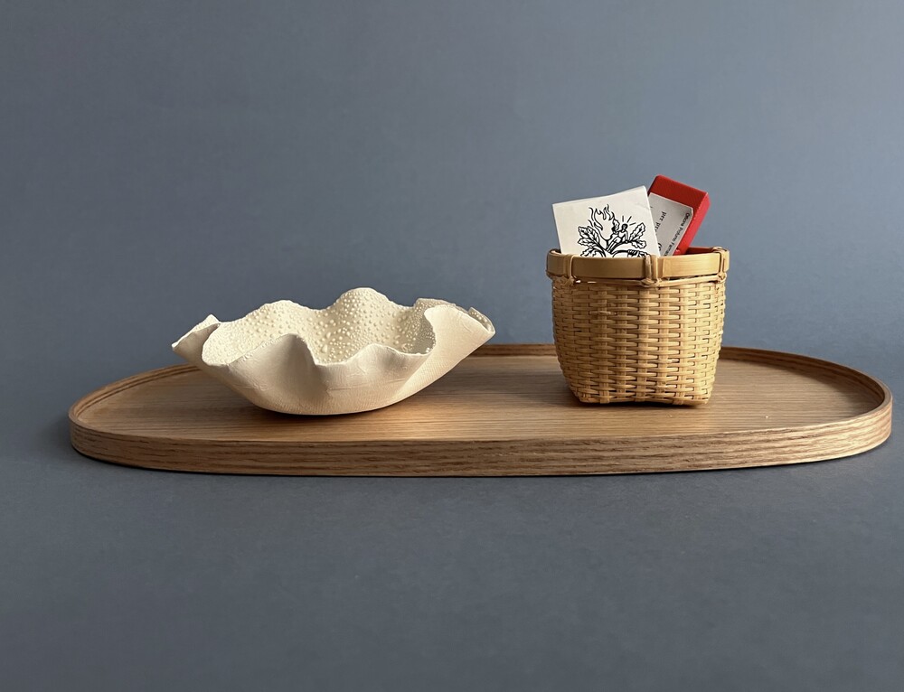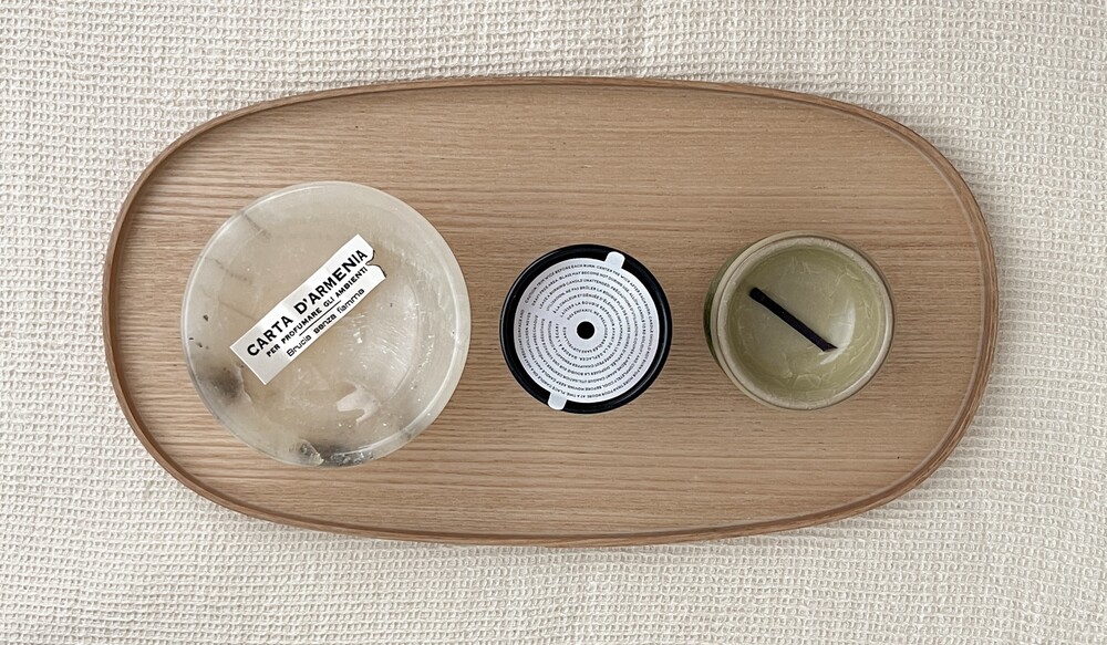 일립스 트레이는 각진 캔들도, 플라운스 형태의 볼도 안정감 있게 담아냅니다.