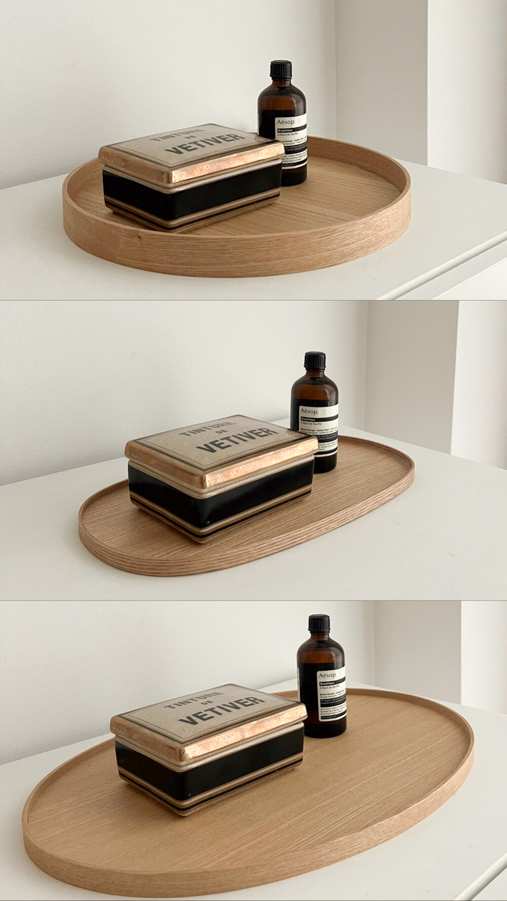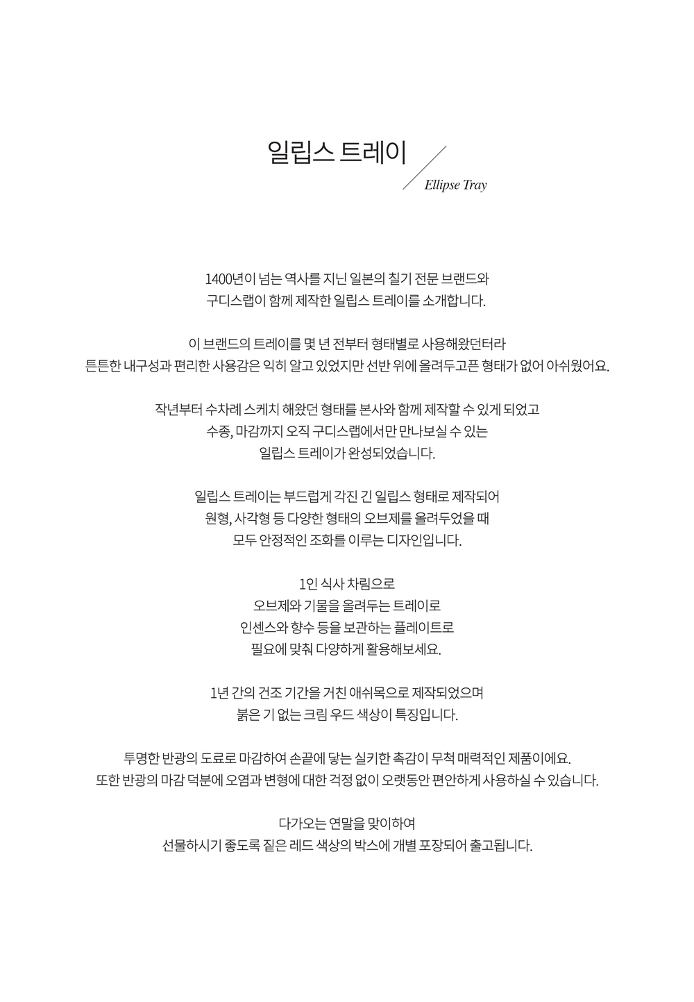일립스 트레이는 적당한 공간과 안정적인 여백만 남겨 시각적인 균형을 완성합니다.