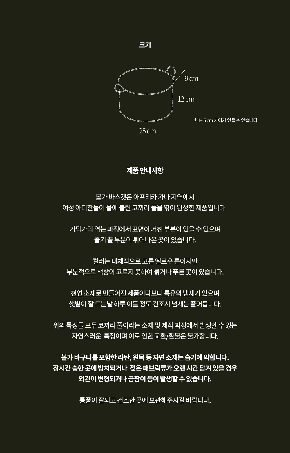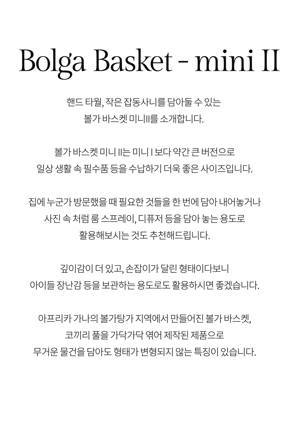 많은 사랑을 받은 볼가 바구니의 미니 II 버전을 소개합니다. 코끼리 풀을 엮어 완성한 제품으로 미니 보다는 약간 더 큰 사이즈로 과일 등을 담아두기에 적합한 크기입니다.